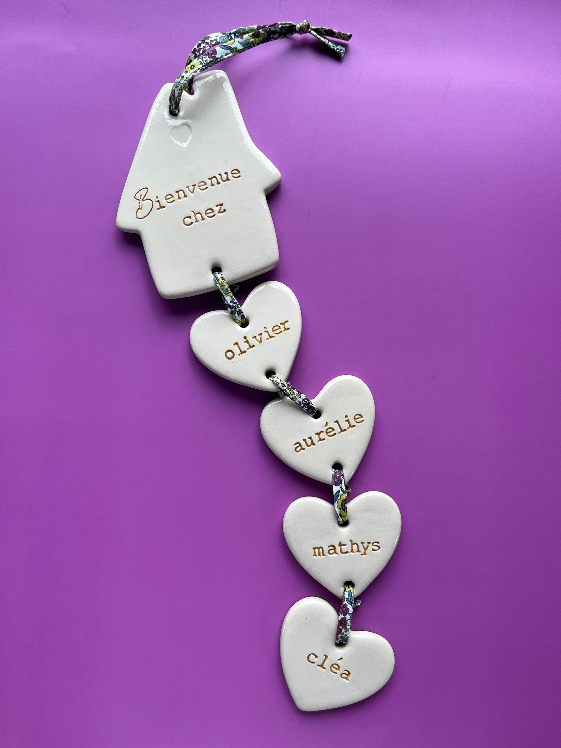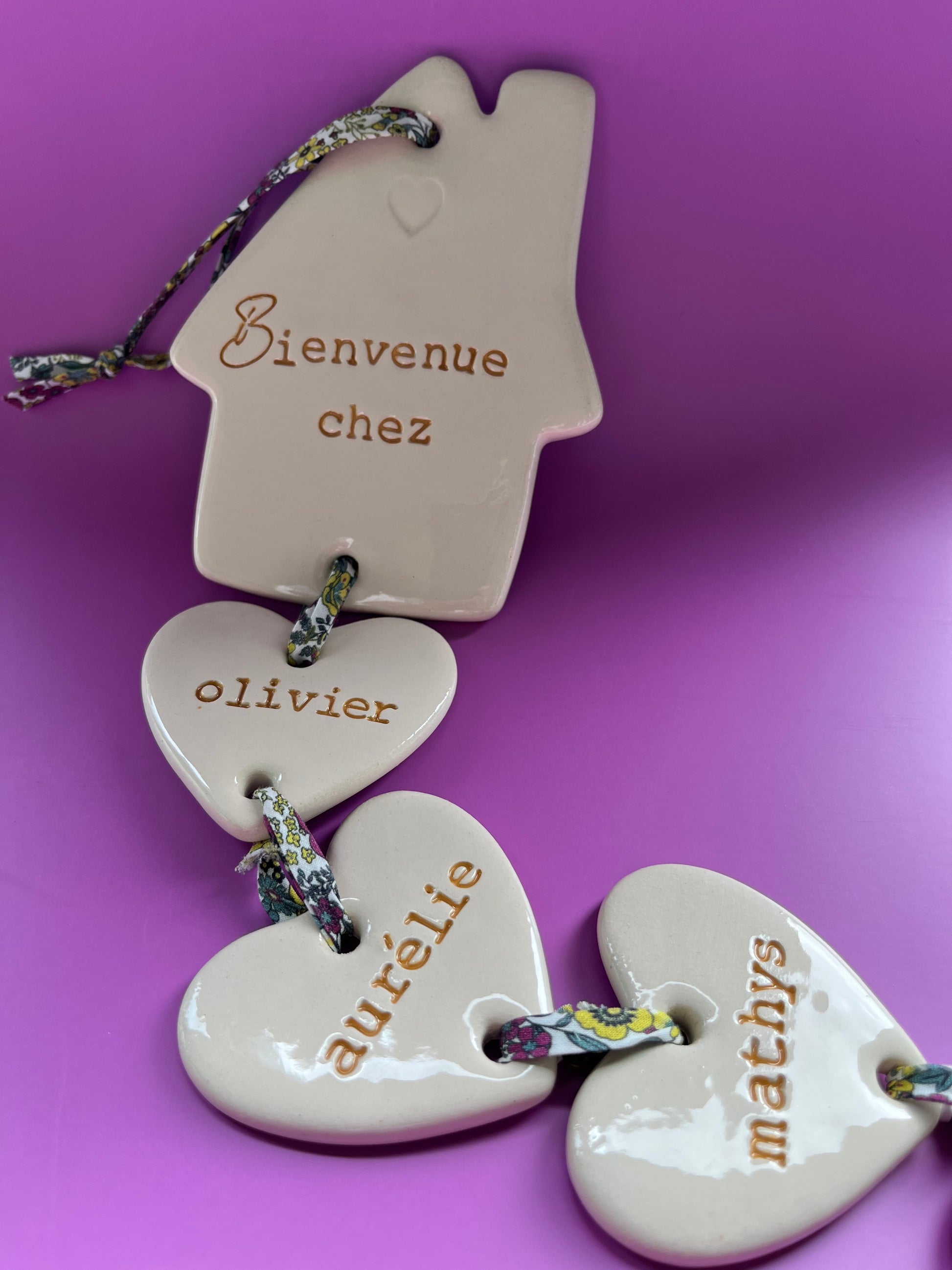 Chaque pièce commence par une petite maison en faïence blanche, gravée de l’inscription "Bienvenue chez...", suivie de cœurs suspendus représentant les membres de votre famille. Les prénoms sont délicatement estampés dans l’argile, puis colorés pour rester lisibles tout en douceur.