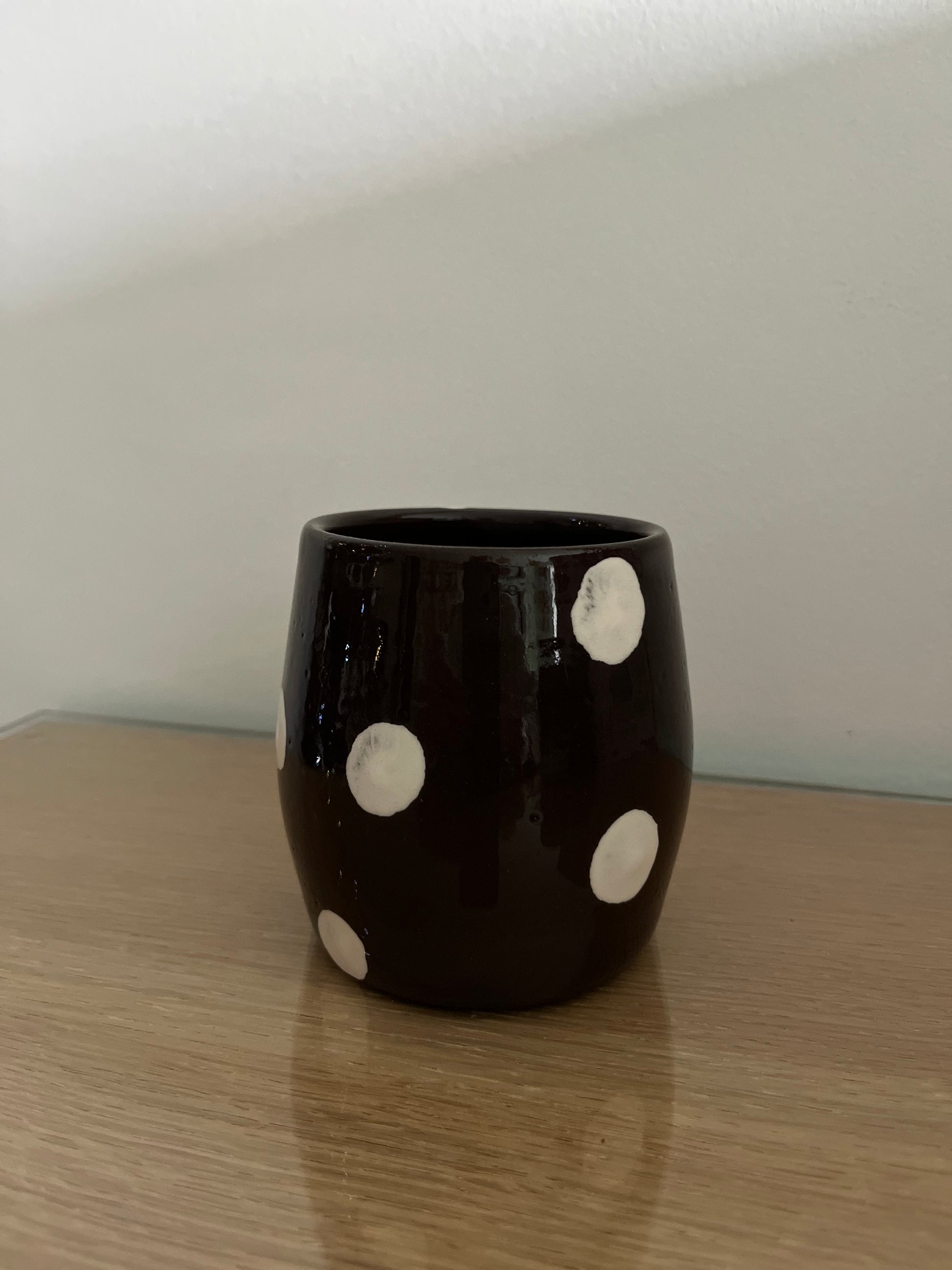 Faïence noire qui donne une jolie teinte chocolat en 2ème cuisson, décor à l'engobe, émail transparent.