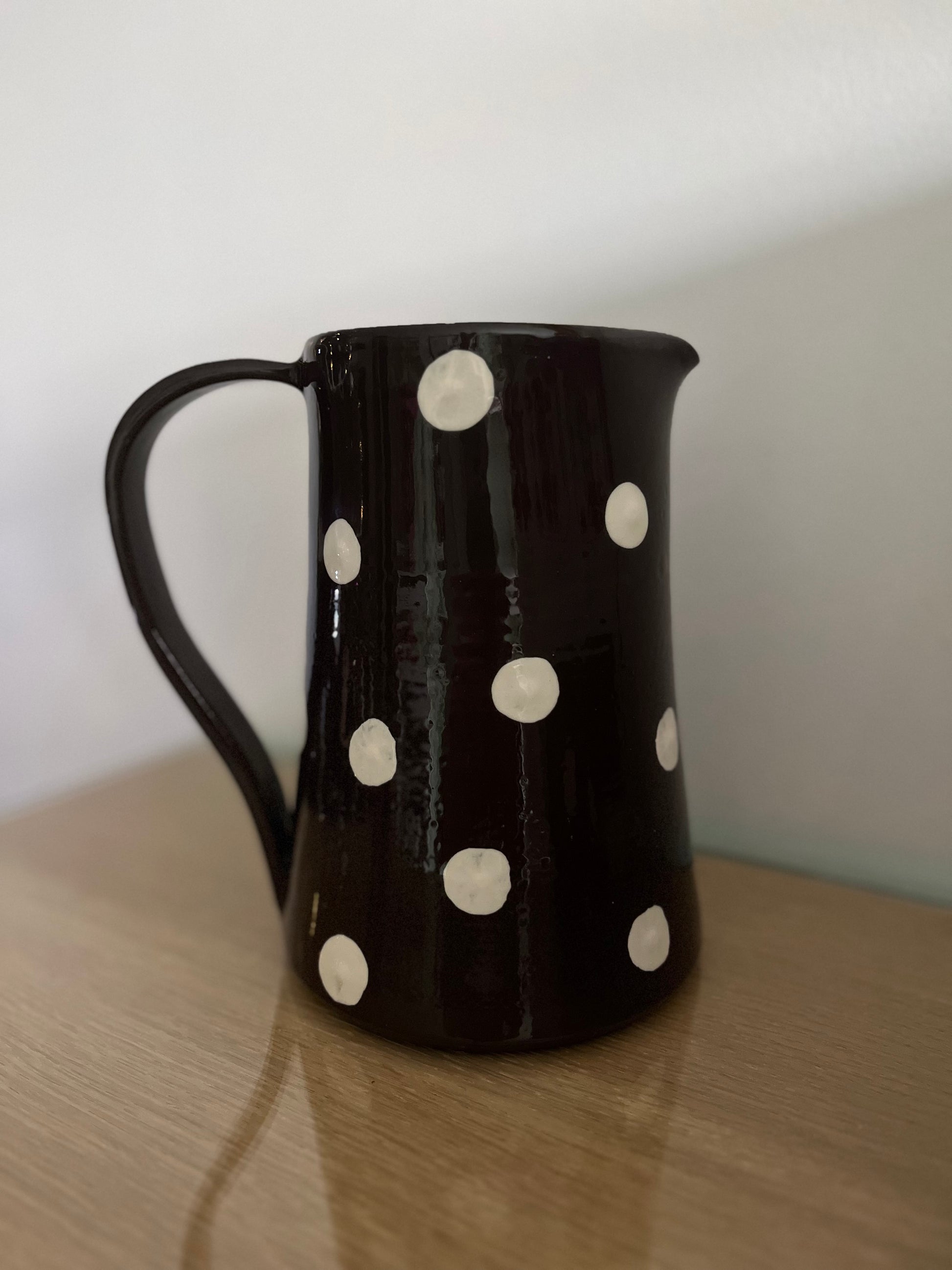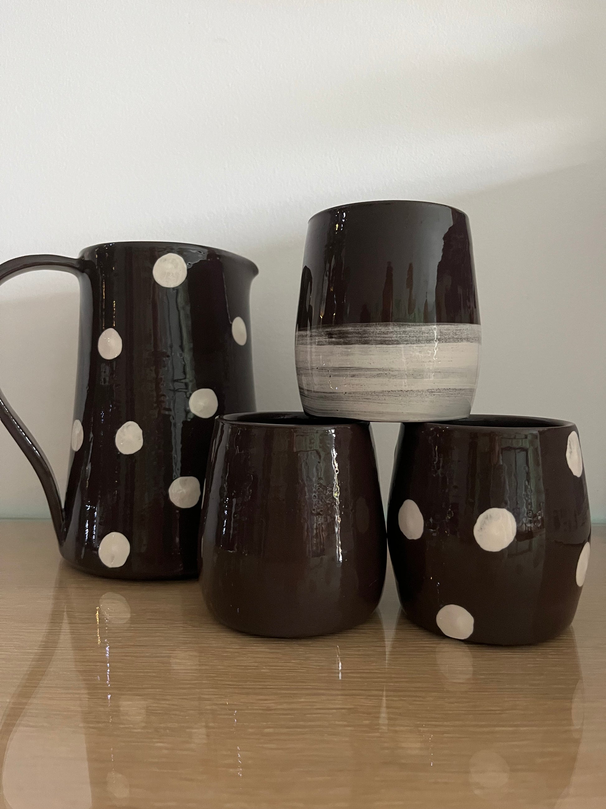 Faïence noire qui donne une jolie teinte chocolat à la 2ème cuisson, décor à l'engobe, émail transparent.